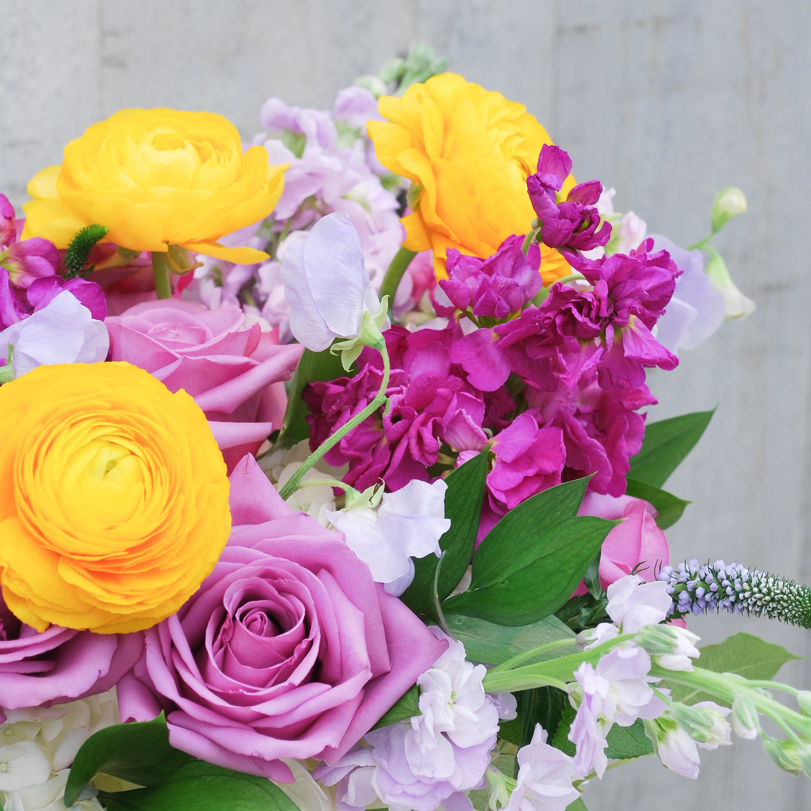 This bold and unique floral arrangement mimics the fruitiness and freshness you expect with a Blackberry Bramble cocktail. Stunning hues of lavender and plum are complemented by buttercup yellow and fresh, bright greenery.