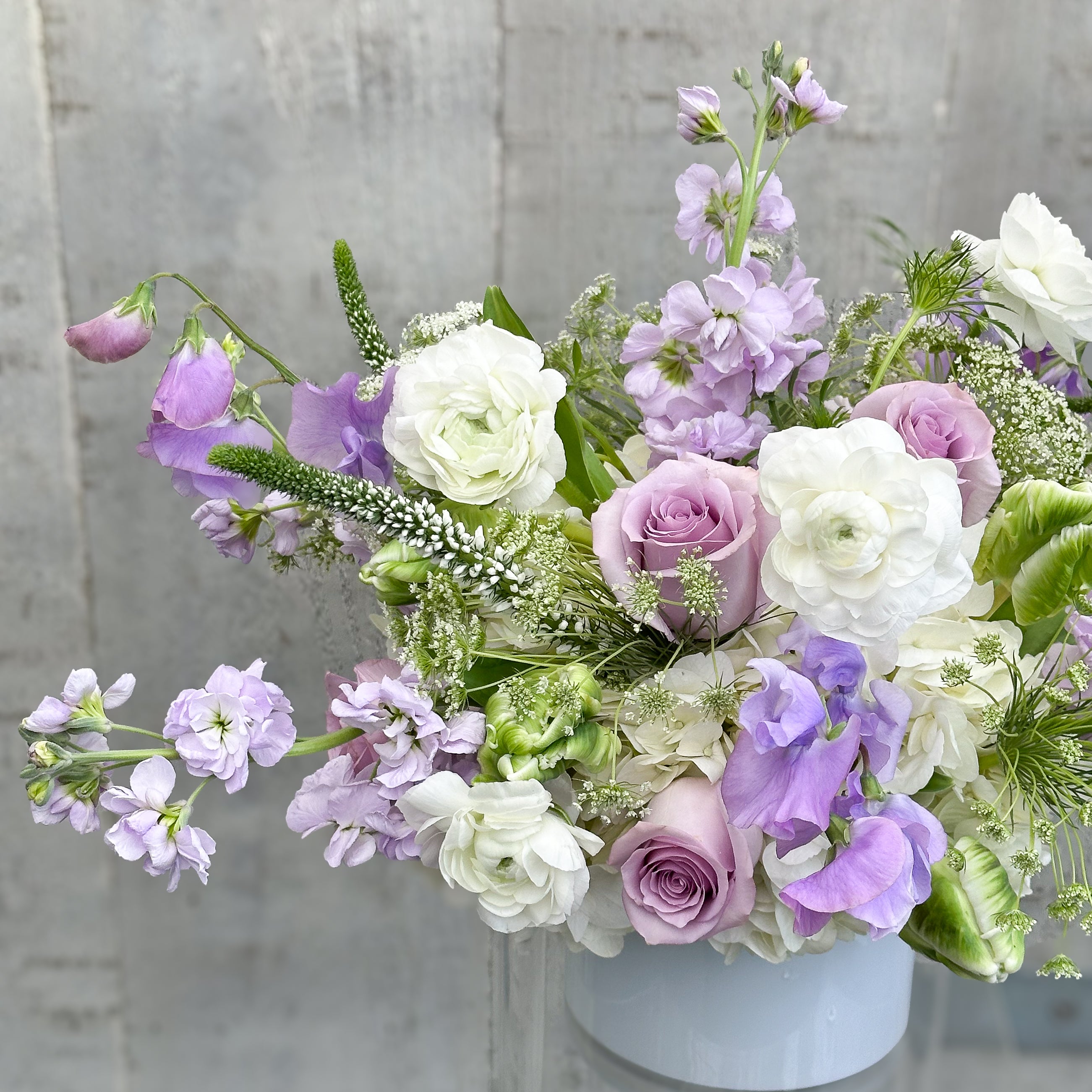 Bursting with freshness, this stunning arrangement will instantly brighten anyone's day. Our Mojito arrangements are textural and interesting, in shades of purple (or blue), green, and white.