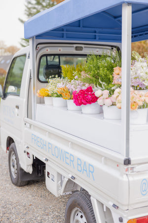 Our charming, vintage flower truck will pop up (or roll in, rather!) at your business, home, or event venue, loaded with seasonal blooms for your guests to hand-select a customized, lush, beautiful floral bouquet.